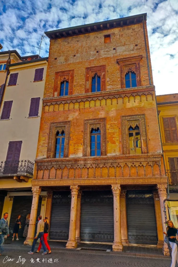 又稱為博尼福特之家Casa di Boniforte,由一位來自孔科雷佐Concorezzo的富裕紡織品商人喬瓦尼·博尼福特Giovanni Boniforte委託興建。這座三層建築外牆以陶磚砌成,鮮橘色非常搶眼,窗框以細小的鍍金葉片圖案裝飾,融合了威尼斯風格和晚期哥德式元素。底層由一系列拱廊組成,以 維羅納Verona紅色大理石柱 支撐。