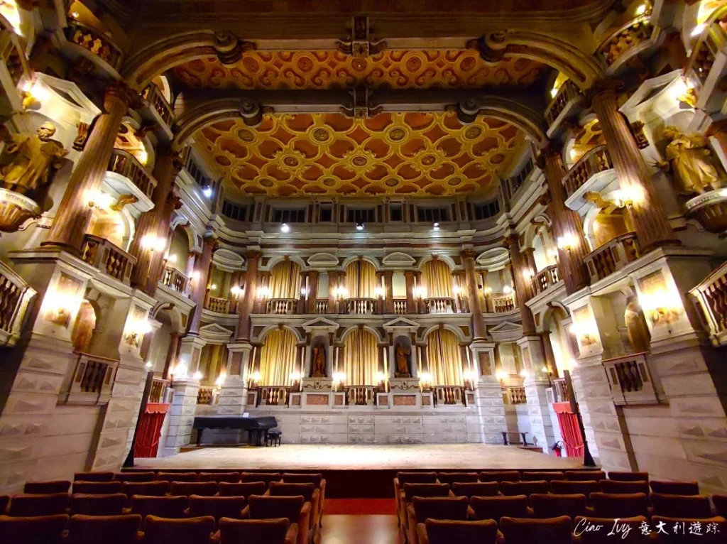 劇院平面呈鐘形,由多層木製包廂組成,前方有一個固定舞台,在其後方建造了兩條交疊的走廊,形成一個兩層高的涼廊,天花板飾以仿鏤空雕花,保留了原本的巴洛克風格。棗紅色的復刻椅子、裝飾精美的包廂,風格華麗,配上柔和淡黃燈光,充滿濃厚懷舊情懷。少年莫札特曾在這所劇院舉辦了一場鋼琴音樂會,不禁令人想像當時他揮動指頭在琴鍵上跳動,在舞台上演出的瞬間彷彿永恆凝住。