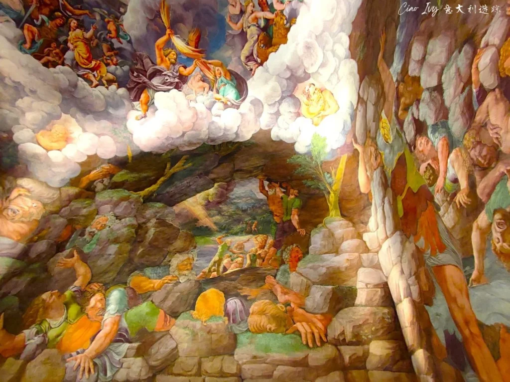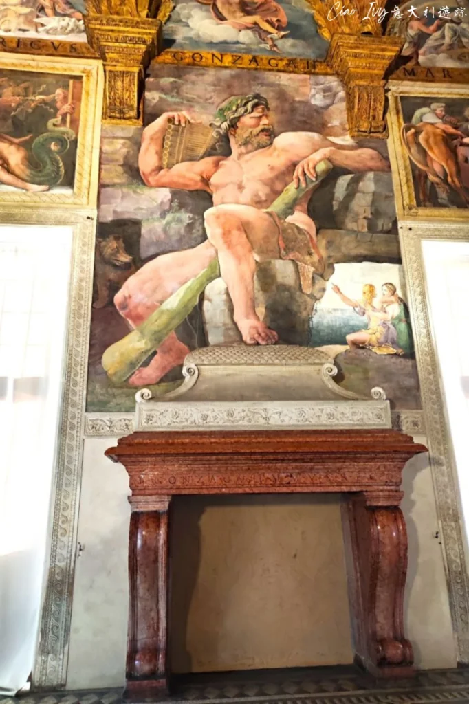 巨人廳 Sala dei Giganti 建於1532年至1535年間,是整座宮殿最大、最著名的大廳。廳內的壁畫《巨人的隕落》,從牆壁到圓頂覆蓋了整個房間,以錯覺手法描繪了巨人試圖攀登奧林匹斯山與宙斯之間的戰鬥。岩石崩落、神雷墜下,構圖氣勢磅礴,震撼力十足,離遠觀看彷彿置身其中,被捲入這場神話。但當近看畫功略嫌粗糙不如其他大廳壁畫那樣細緻。