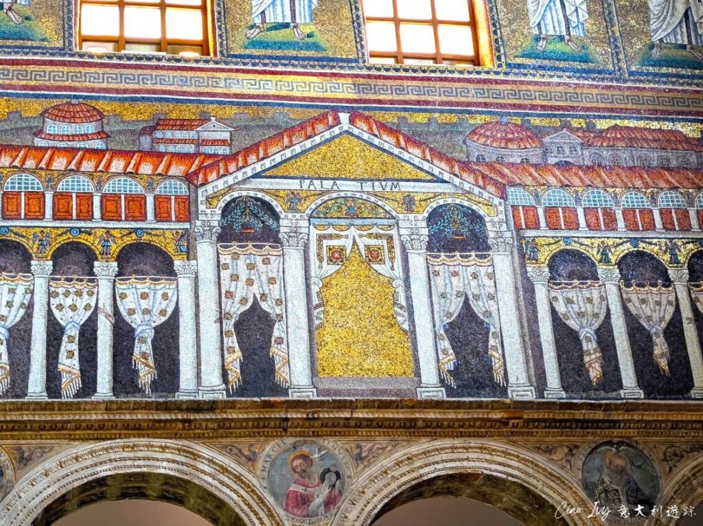 馬賽克當中融入當代古城克拉塞Classis 和狄奧多里克宮的寫實畫,無疑為了歌功頌德,强調神聖歷史與王權合一。