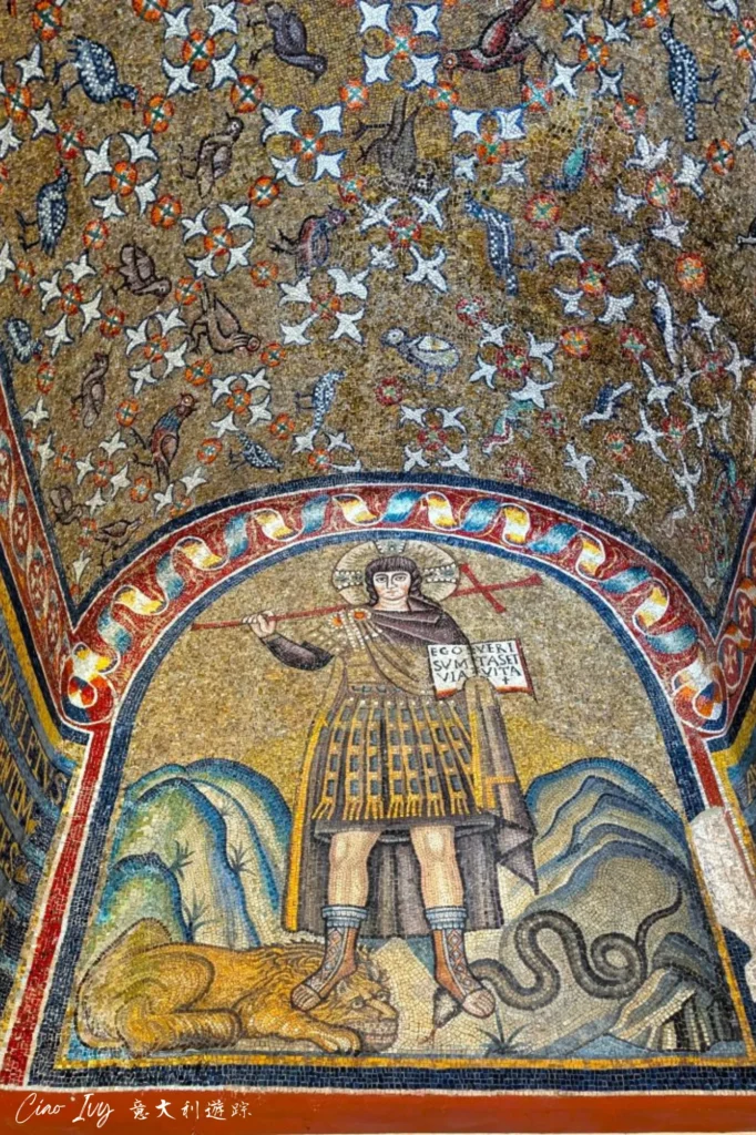 門廳入口處上方的馬賽克描繪基督戰士的形像,身著紫色披風和盔甲,右肩扛著十字架,左手拿著聖言。