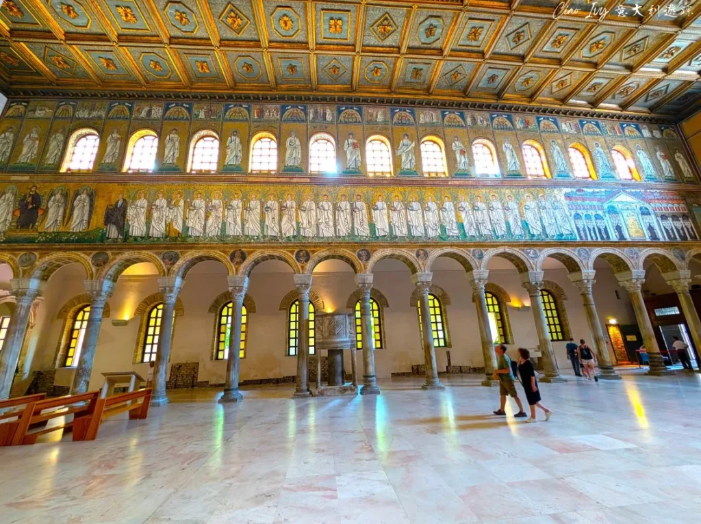 教堂中殿由十二對相對的柱子支撐著圓拱,而最珍貴、最著名的早期基督教和古代馬賽克鑲嵌畫就在左右兩邊上方牆壁。馬賽克的原始創作源自東哥德時期狄奧多里克統治期間,後來在拜占庭統治時期部分經過修改。壁畫運用大量金色作為背景装飾,色彩鮮豔華麗,目光很難不被吸引住,就像翻開長畫卷,一幕幕經典的聖經故事呈現眼前。