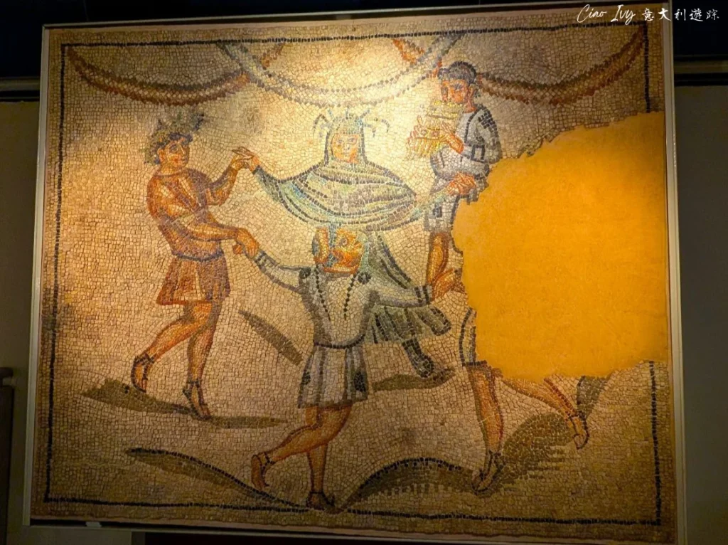 其中最引人注目的是一幅《四季之舞》Danza delle Stagioni 的馬賽克鑲嵌畫,描繪四季精靈們伴著樂師的樂聲翩翩起舞。另外是《好牧人》Buon Pastore 的地板馬賽克,畫中描繪了一名青年牧羊人倚著手杖,周圍是正在吃草的羊群,旁邊兩隻孔雀棲息在樹枝之上,彷彿為牧羊人頭頂戴上了光環。